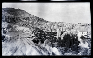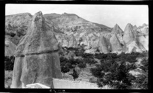 Part of a collection of images from Dawkins' travel to Cappadocia and Pharasa between 1909 and 1911. The original description in the SPHS register reads: "Valley between Sinasos & Urgub". The SPHS negative register also indicates this negative is missing.