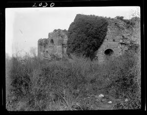 Part of a collection of images from the travels of Hasluck and Woodward to Rhodes, Telmessos, Attaleia [Adalia], Perge, Sillyon, and Aspendos in 1909. The original description in the SPHS register reads: "Perge: Tower on east town wall from inside".