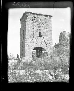 Part of a collection of images from the travels of Hasluck and Woodward to Rhodes, Telmessos, Attaleia [Adalia], Perge, Sillyon, and Aspendos in 1909. The original description in the SPHS register reads: "Perge: W. wall from Acrop. Tower 1 in foreground".
