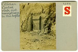 Part of a collection of images of Hasluck's travels in 1909 to Cyprus and Anatolia. The original description in the SPHS register reads: "Cilician Gate: Rock cut inscription in the defile".
