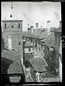 Part of a series of images taken by F.W. Hasluck during the course of his visit to Mount Athos in 1911. The original description in the SPHS register reads: "Athos: Zográphou: E. side of court with clock tower".