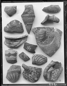 Part of the collection of images of the British School at Athens excavations at Kamares Cave, Crete in 1913. The original description in the SPHS negative register reads: "Kamares cave: terra cotta lids".