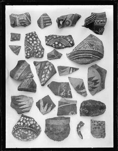 Part of the collection of images of the British School at Athens excavations at Kamares Cave, Crete in 1913. The original description in the SPHS negative register reads: "Kamares cave: sherds, dark on light".