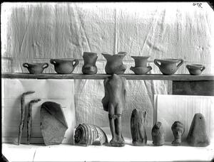 Part of the collection of images, 1905, of the British School at Athens excavations at Angelona, Laconia. The original description in the SPHS register reads: "Angelona: miscellaneous objects BSA xi. p. 85".
