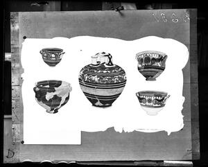 Part of a collection of images of the BSA's 1920s excavations at Mycenae. The original description in the SPHS register reads: "(a) platter from M. H. burial. (b) Stirrup vase with duck frieze of LH. III Style".