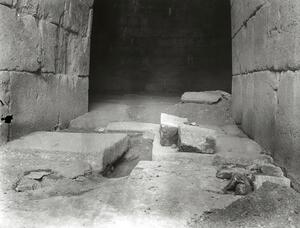 Part of a collection of images of the BSA's 1920s excavations at Mycenae. The original description in the SPHS register reads: "Mycenae: Treasury of Atreus. Threshold".