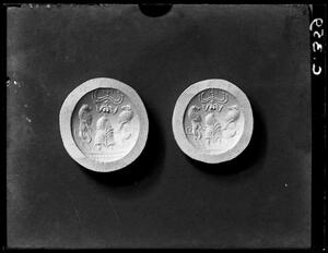 Part of a collection of images of the BSA's 1920s excavations at Mycenae. The original description in the SPHS negative register reads: "Mycenae: gems of snake goddesses, with double axe, between lions". Recorded in the register as from the 1921 season.