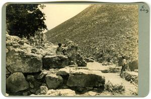 Part of a collection of images of the BSA's 1920s excavations at Mycenae. The original description in the SPHS negative register reads: "Mycenae, Palace great S. stairway from W".