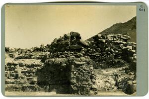 Part of a collection of images of the BSA's 1920s excavations at Mycenae. The original description in the SPHS negative register reads: "Mycenae, Palace court N wall". Recorded in the register as from the 1923 season.