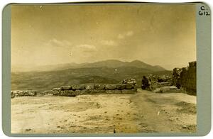 Part of a collection of images of the BSA's 1920s excavations at Mycenae. The original description in the SPHS negative register reads: "Mycenae: Citadel from West (General View) BSA XXV frontispeice".