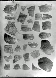 Part of a group of images from the British School at Athens excavations at Palaikastro, Crete in the 1902-1905. The original description in the SPHS negative register reads: "PK. pottery from Palaikastro".