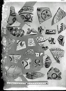 Part of a group of images from the continuation of excavations in 1910-1911 at Phylakopi on the island of Melos previously conducted by the British School at Athens from 1896-1899. The original description in the SPHS register reads: "Phylakopi Pottery: Geometric sherds".