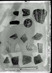 Part of a group of images from the continuation of excavations in 1910-1911 at Phylakopi on the island of Melos previously conducted by the British School at Athens from 1896-1899. The original description in the SPHS register reads: "Phylakopi Pottery: Miscellaneous sherds red & black?".