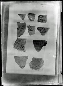 Part of a collection of images of from Wace, Droop & Thompson's excavations at the site of Zerelia in 1908. The original description in the SPHS register reads: "Zerelia: incised sherds".