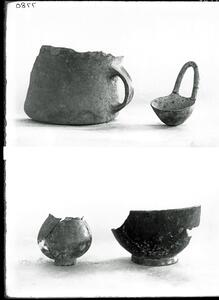 Part of a collection of images of from Wace, Droop & Thompson's excavations at the site of Zerelia 1908. The original description in the SPHS register reads: "Thessaly: Zerelia, shapes of two vases of the 7th settlement".
