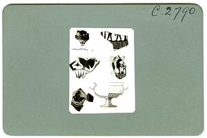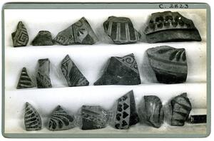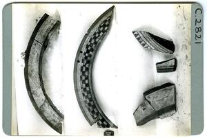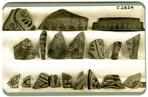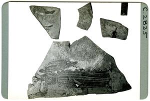 Part of the collection of images, 1924-1927, of the British School at Athens excavations at Sparta, Laconia. The original description in the SPHS register reads: "Sparta 1924-27, Acropolis. Pottery, Laconian (?) 2 fragments of black-glazed ware with figures in added white".