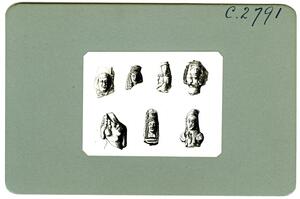Part of the collection of images, 1924-1927, of the British School at Athens excavations at Sparta, Laconia. The original description in the SPHS register reads: "Sparta 1926, Acropolis. Seven archaic terracotta heads, etc."