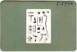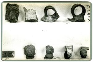 Part of the collection of images, 1924-1927, of the British School at Athens excavations at Sparta, Laconia. The original description in the SPHS register reads: "Sparta 1926, Acropolis. Various early bronzes: pins, hinges, helmeted head &c.".