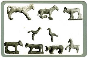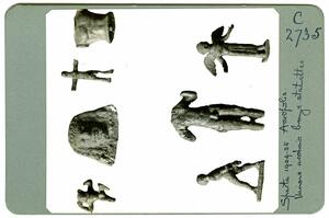 Part of the collection of images, 1924-1927, of the British School at Athens excavations at Sparta, Laconia. The original description in the SPHS register reads: "Sparta, 1924-5. Acropolis. Various archaic bronze statuettes, animals and birds".