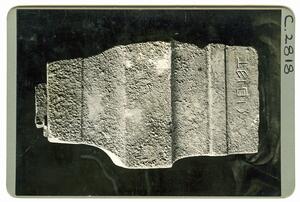 Part of the collection of images, 1924-1927, of the British School at Athens excavations at Sparta, Laconia. The original description in the SPHS register reads: "Sparta 1924, Acropolis. Top of votive marble stele inscribed Teîhis (retrograde)".