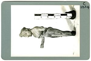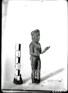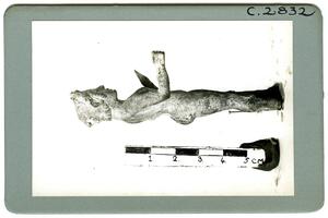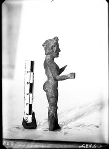 Part of the collection of images, 1924-1927, of the British School at Athens excavations at Sparta, Laconia. The original description in the SPHS register reads: "Sparta 1927, Acropolis. Bronze. Archaic nude female statuette (profile T)".