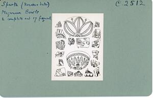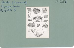Part of the collection of images, 1924-1927, of the British School at Athens excavations at Sparta, Laconia. The original description in the SPHS register reads: "Sparta 1927, Acropolis. Pottery. Laconian: eleven figured fragments, incl. 2 with Gorgoneion".