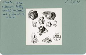 Part of the collection of images, 1924-1927, of the British School at Athens excavations at Sparta, Laconia. The original description in the SPHS register reads: "Sparta, 1924, moulded protomae & fragments of moulds".