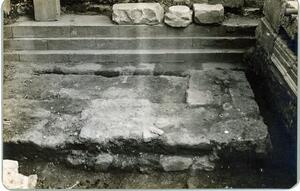 Part of the collection of images, 1924-1927, of the British School at Athens excavations at Sparta, Laconia. The original description in the SPHS register reads: "Sparta 1924. Theatre. Late Byz. wall & paving above stage.