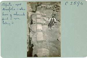 Part of the collection of images, 1924-1927, of the British School at Athens excavations at Sparta, Laconia. The original description in the SPHS register reads: "Sparta, 1926. Bastion of East outer stairs, Theatre".