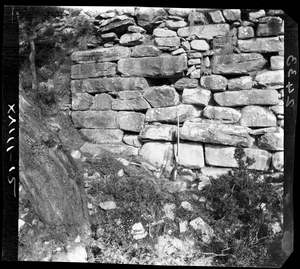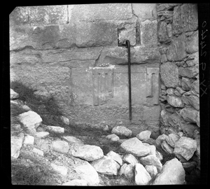 Part of a series of images from the island of Thasos by John ff. Baker-Penoyre during his visit in 1907 to map areas of archaeological interest, particularly the site of Limena, and to conduct investigations of ancient architecture. The original description of the image in the SPHS register reads: "Thasos: Limenas: City wall, stele outside south wall where west path to Panagia crosses".