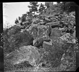 Part of a series of images from the island of Thasos by John ff. Baker-Penoyre during his visit in 1907 to map areas of archaeological interest, particularly the site of Limena, and to conduct investigations of ancient architecture. The original description of the image in the SPHS register reads: "Thasos: Limenas, Acropolis. N.E. wall".