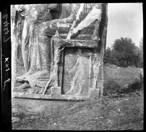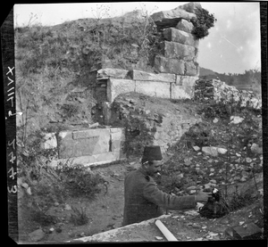 Part of a series of images from the island of Thasos by John ff. Baker-Penoyre during his visit in 1907 to map areas of archaeological interest, particularly the site of Limena, and to conduct investigations of ancient architecture. The original description of the image in the SPHS register reads: "Thasos: Limenas: City wall, detail of same, showing figure beneath throne".