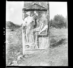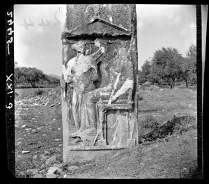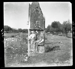 Part of a series of images from the island of Thasos by John ff. Baker-Penoyre during his visit in 1907 to map areas of archaeological interest, particularly the site of Limena, and to conduct investigations of ancient architecture. The original description of the image in the SPHS register reads: "Thasos: Limenas: City wall, stele outside south wall where west path to Panagia crosses (shows whole stele)".