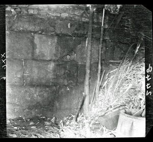 Part of a series of images from the island of Thasos by John ff. Baker-Penoyre during his visit in 1907 to map areas of archaeological interest, particularly the site of Limena, and to conduct investigations of ancient architecture. The original description of the image in the SPHS register reads: "Thasos: Limenas: City wall, west wall, in an outhouse just before wall turns east to spring".