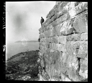 Part of a series of images from the island of Thasos by John ff. Baker-Penoyre during his visit in 1907 to map areas of archaeological interest, particularly the site of Limena, and to conduct investigations of ancient architecture. The original description of the image in the SPHS register reads: "Thasos: Limenas, Acropolis. West wall, Hellenic substructure at S.W. angle of Acropolis".