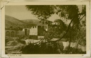 Katholikon - East elevation. Noteworthy is the meander frieze in the central apse. The drawing is entitled: 'Monastery of Daphni Attica'. Further annotation in ink survives.