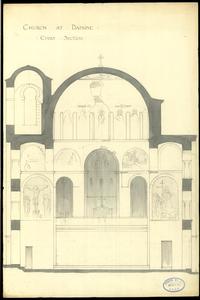 Transverse section of the katholikon with iconography. The drawing is entitled: 'Church at Daphni near Athens', 'Section looking East - 1/4 Scale'.