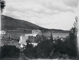View of the monastic complex (showing the funerary chapel) from the east. Further annotation survives at the back of the photograph.