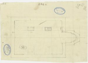 Ground plan. This is a ground plan of the cemeterial chapel, a three-aisled domed basilica dedicated to Hagios Nikolaos, which is located to the east of the monastic complex. A crypt with eight graves has been excavated below the church. The walling of the building is of typical cloisonné. The chapel is dated to the late 11th c. This is a preliminary drawing. Further annotation in pencil survives. A sketch (plan) in pencil survives at the back.