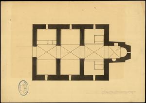 Ground plan. This is a ground plan of the cemeterial chapel, a three-aisled domed basilica dedicated to Hagios Nikolaos, which is located to the east of the monastic complex. A crypt with eight graves has been excavated below the church. The walling of the building is of typical cloisonné. The chapel is dated to the late 11th c. Further annotation in pencil survives.