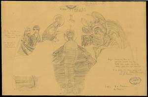 Katholikon - Mosaic decoration. The Drawing depicts three of the images of the Prophets which decorate the dome. This is a preliminary drawing. A unfinished sketch depicting a priest inside a holy bema survives in pencil at the back.