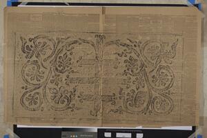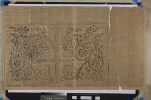 Rubbing - Carved parapet slab. The rubbing is on newspaper ('The Scotsman') dated 23/04/1890.