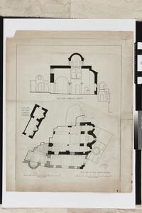 Upper part: Longitudinal section - Lower part: Plan of Lower church (left), Plan of Upper church (right). The drawing is entitled in pencil: 'Mistras, Monastery of the Peribleptos'. It is labelled in ink: 'Section Looking North', 'A Plan of the Lower Church', ' A Plan of the Upper Church'. It Further annotation in pencil survives.
