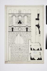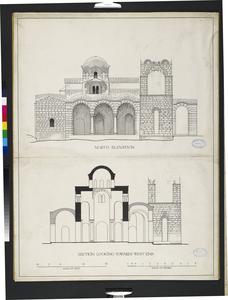 Upper part: North elevation - Lower part: Cross section. The drawing is entitled in pencil: 'Mistras Church of S. Sophia' - It is labelled in ink: 'North Elevation', 'Section Looking Towards West End'. The drawing was exhibited (nos 479-480) in the 1936 Royal Academy exhibition.