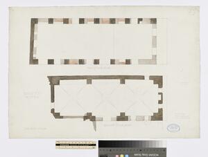 Elevation and two plans of the refectory. The drawing is entitled in pencil. It was exhibited in the 1936 Royal Academy Exhibition as panel 495 in the catalogue