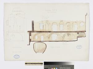 Cross section (lower part of the church). This is a preliminary drawing. It is annotated in pencil.