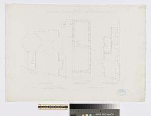 South elevation - East elevation - Cornelling (details). The drawing is entitled in pencil: 'House no 1 Mistras'. It is labelled in pencil: 'South Elevation', 'East Elevation', 'Details of Corbelling'. Further annotation in pencil survives. The drawing is annotated in two different handwritings in pencil on the reverse. It is signed: 'Houses at Mistras, W. S. George' and is dated: 'Drawings Mistras Houses from W.S. George 03/07/09' in a handwriting that strongly recalls that of R. Weir-Schultz. See: Corporate Records Letter from W.S.George to R.Weir-Schultz (July 1909).