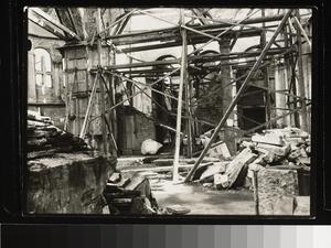 Restoration works: View of the interior of the nave (west end). Further annotation in pencil survives at the back of the photograph. Copyright through Soteriou.