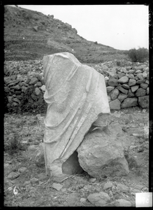 Part of a group of images from explorations and excavations on the island of Melos conducted by the British School at Athens from 1896 to 1899. The original description in the SPHS register reads: "Melos: Tramythia: statute of hierophant, front view".