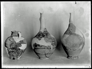 Part of a group of images from explorations and excavations on the island of Melos conducted by the British School at Athens from 1896 to 1899. The original description in the SPHS register reads: "Phylakopi pottery: painted geometric, unpainted jug of Kamares shape".